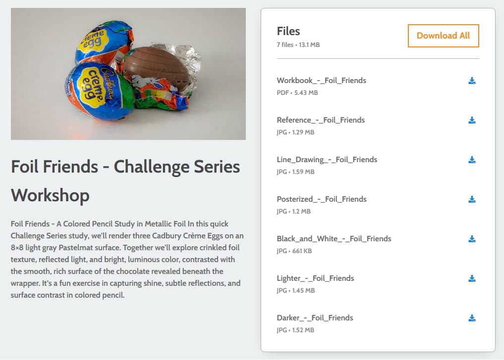 Foil Friends – a playful and practical still life challenge designed to help you confidently render shiny foil surfaces, reflective color shifts, and layered textures using colored pencil (with optional solvent).